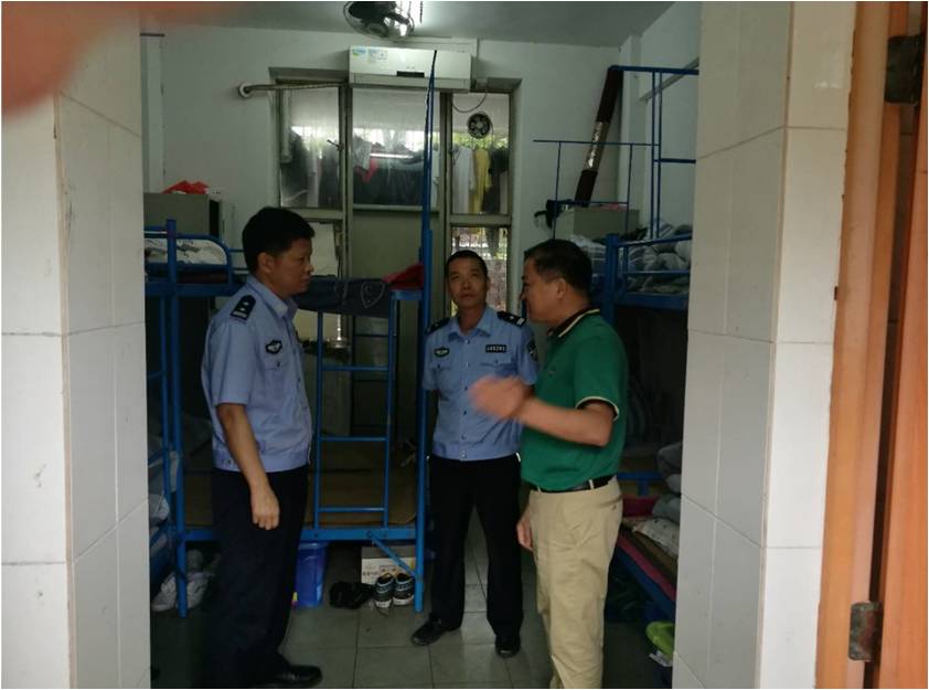 2、李副校长进入学生宿舍里面向区镇消防队领导介绍学生宿舍的安全消防工作情况。