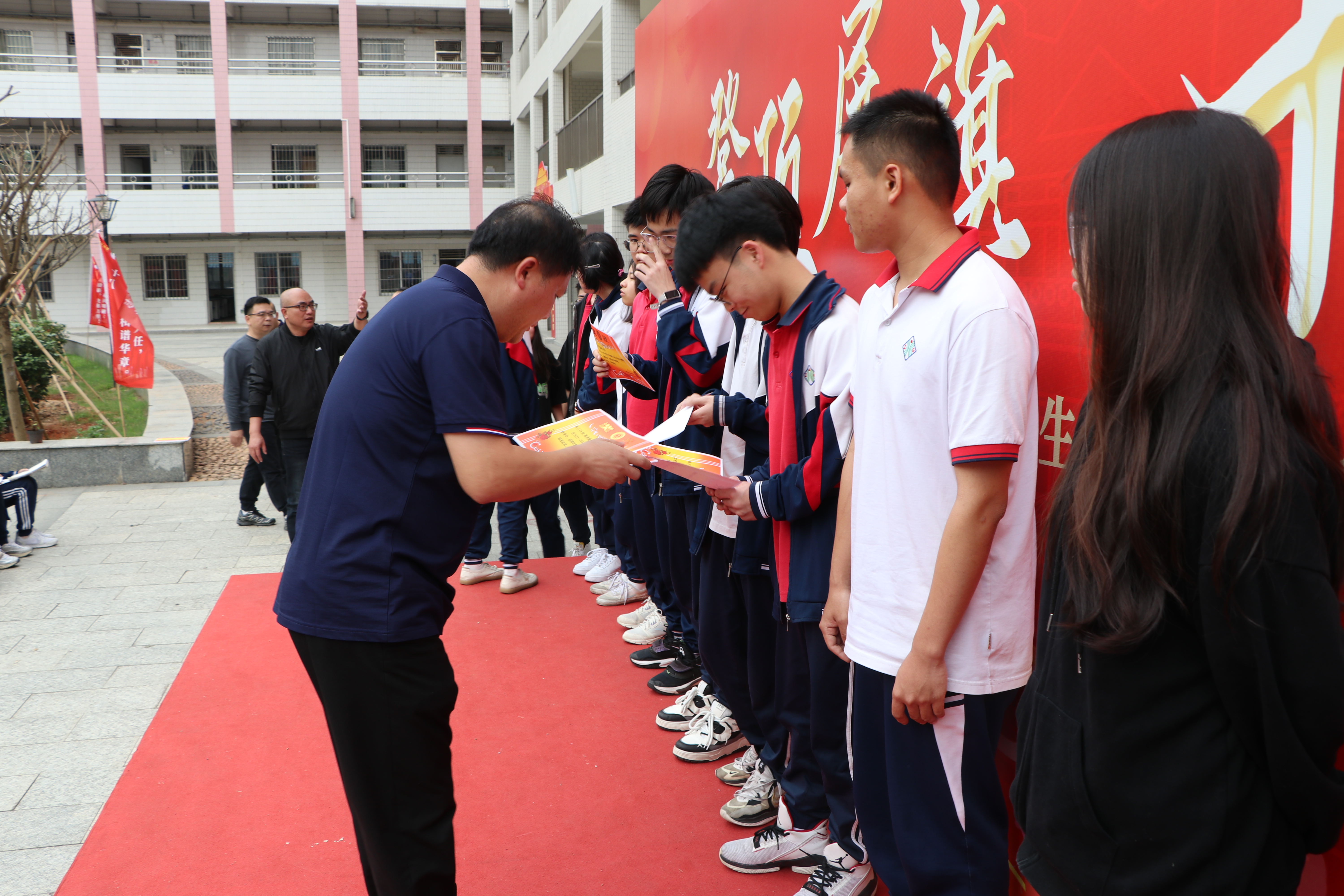 在这个春光明媚的日子里,高三师生在胜利广场举行3月模拟考试表彰大会。本次表彰大会由潘浩才主任主持,余副校长和沈主任担任颁奖嘉宾。上台受表彰的有两类同学:成绩特优秀和进步特等奖的同学。